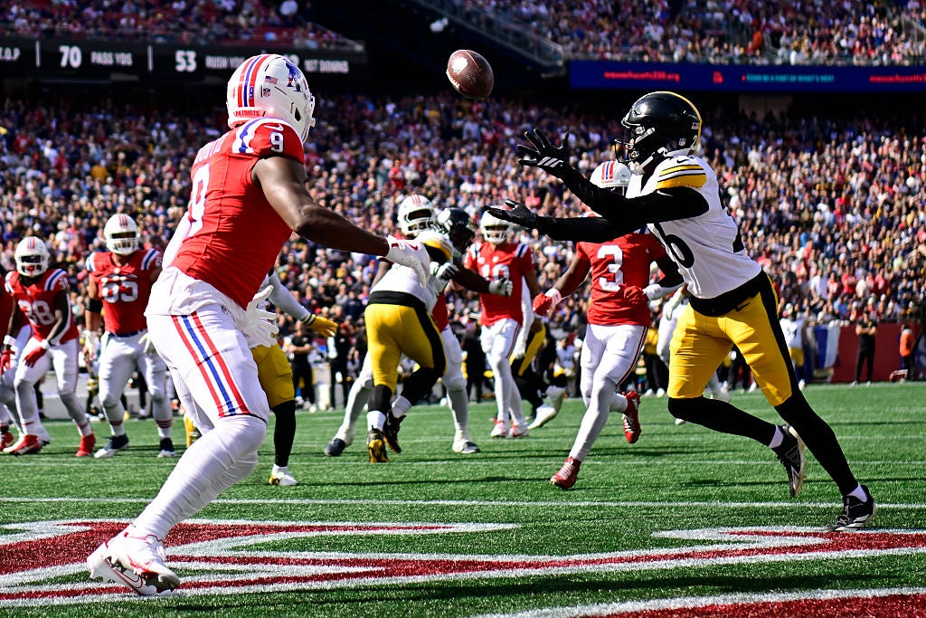 FOXBOROUGH, MASSACHUSETTS - SEPTEMBER 21: Brandin Echols #26 of the Pittsburgh Steelers tackles Demario Douglas #3 of the New England Patriots during the fourth quarter at Gillette Stadium on September 21, 2025 in Foxborough, Massachusetts. (Photo by Jordan Bank/Getty Images)Jordan Bank/Getty Images