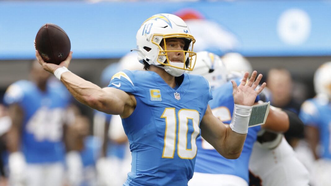 The Chargers dominated possession in the first half, but three sacks of Justin Herbert helped keep them from adding to their point total. Herbert is 10-of-20 for 128 yards and Johnston has five catches for 77 yards.