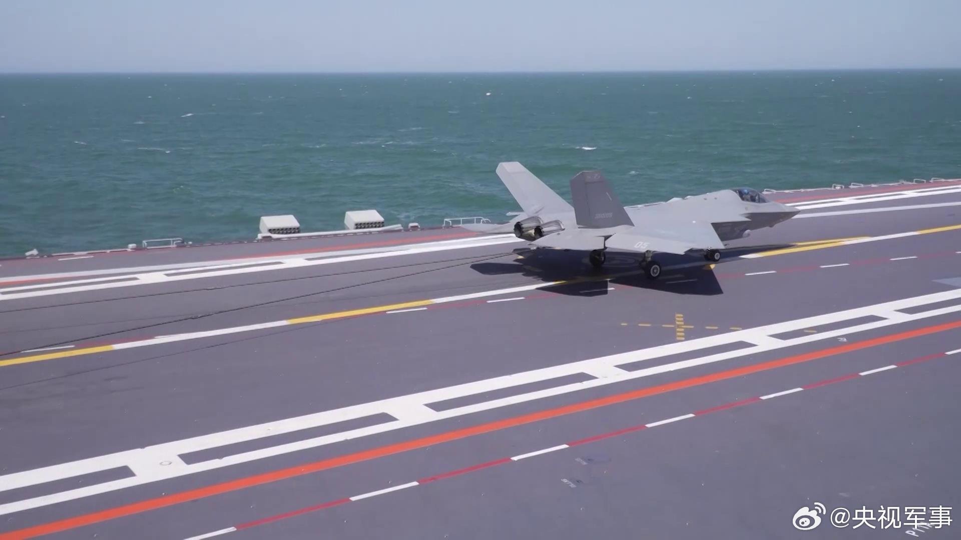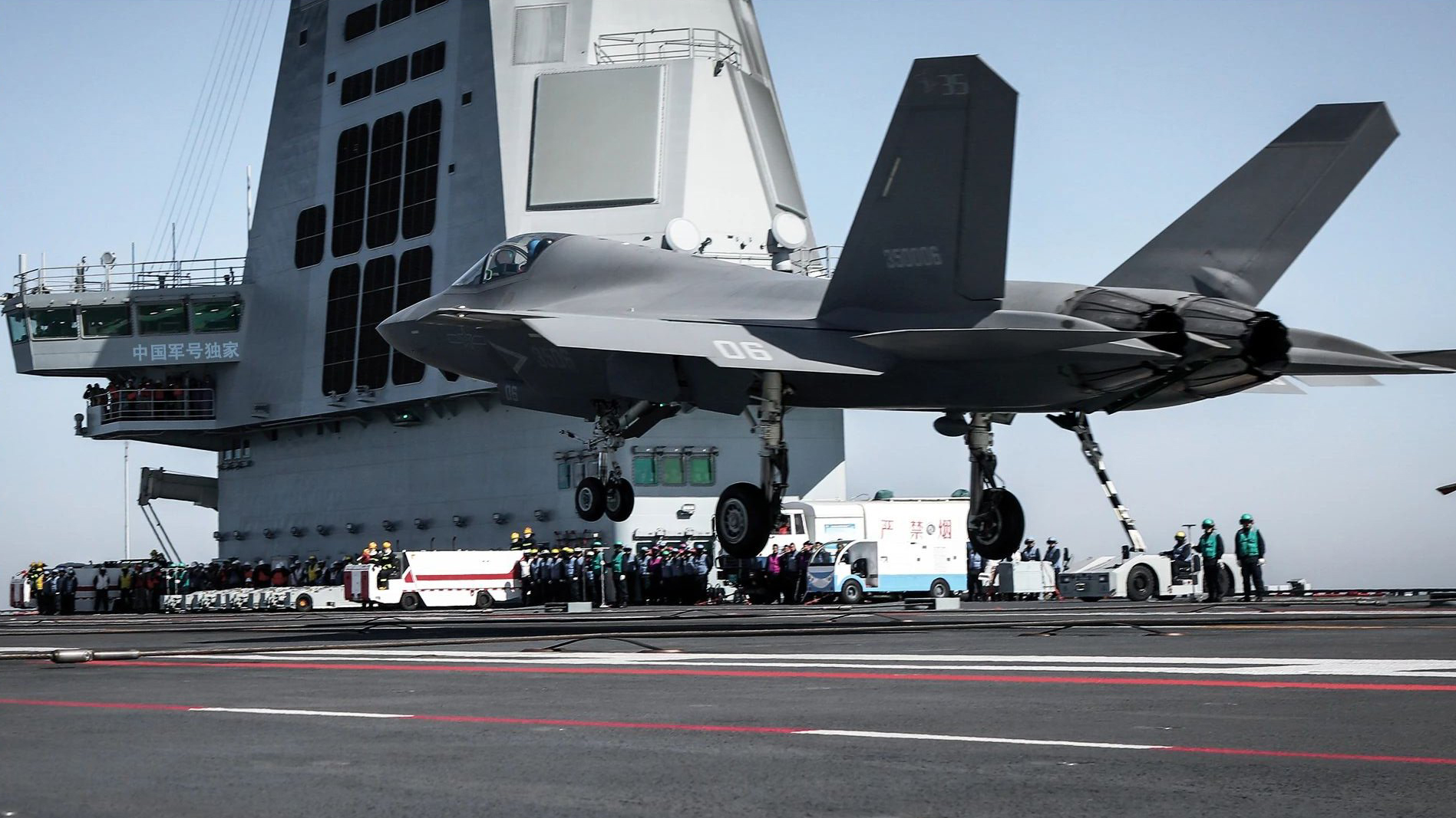 The J-35 is the PLAN’s next-generation carrier fighter, a stealthy design that was intended to conduct catapult takeoff but assisted recovery (CATOBAR) operations from the outset. Developed from the land-based FC-31, there are also signs that the J-35, like the J-15T, might also eventually embark on the Liaoning and Shandong. Until now, however, it hadn’t been seen taking part in any kind of carrier operations, other than in the form of mock-ups.
