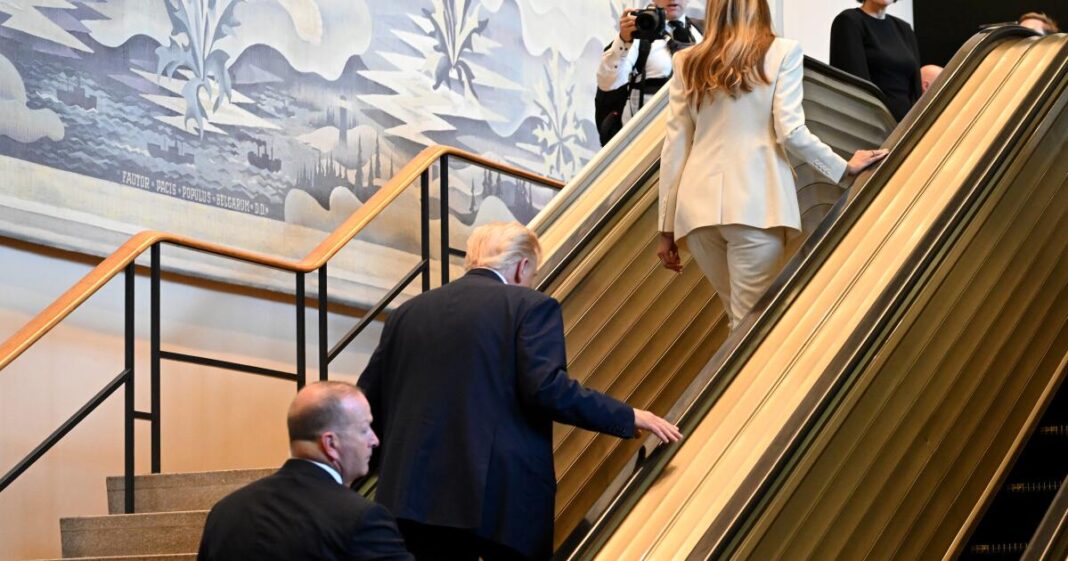 Like Watters, White House Press Secretary Karoline Leavitt smelled escalator sabotage and said as much in an X post: “If someone at the UN intentionally stopped the escalator as the President and First Lady were stepping on, they need to be fired and investigated immediately.” She shared a screenshot of a Sunday article from the Times of London with reporting that said U.N. staff members had “joked that they may turn off the escalators” and “tell him they ran out of money so he has to walk up the stairs.”