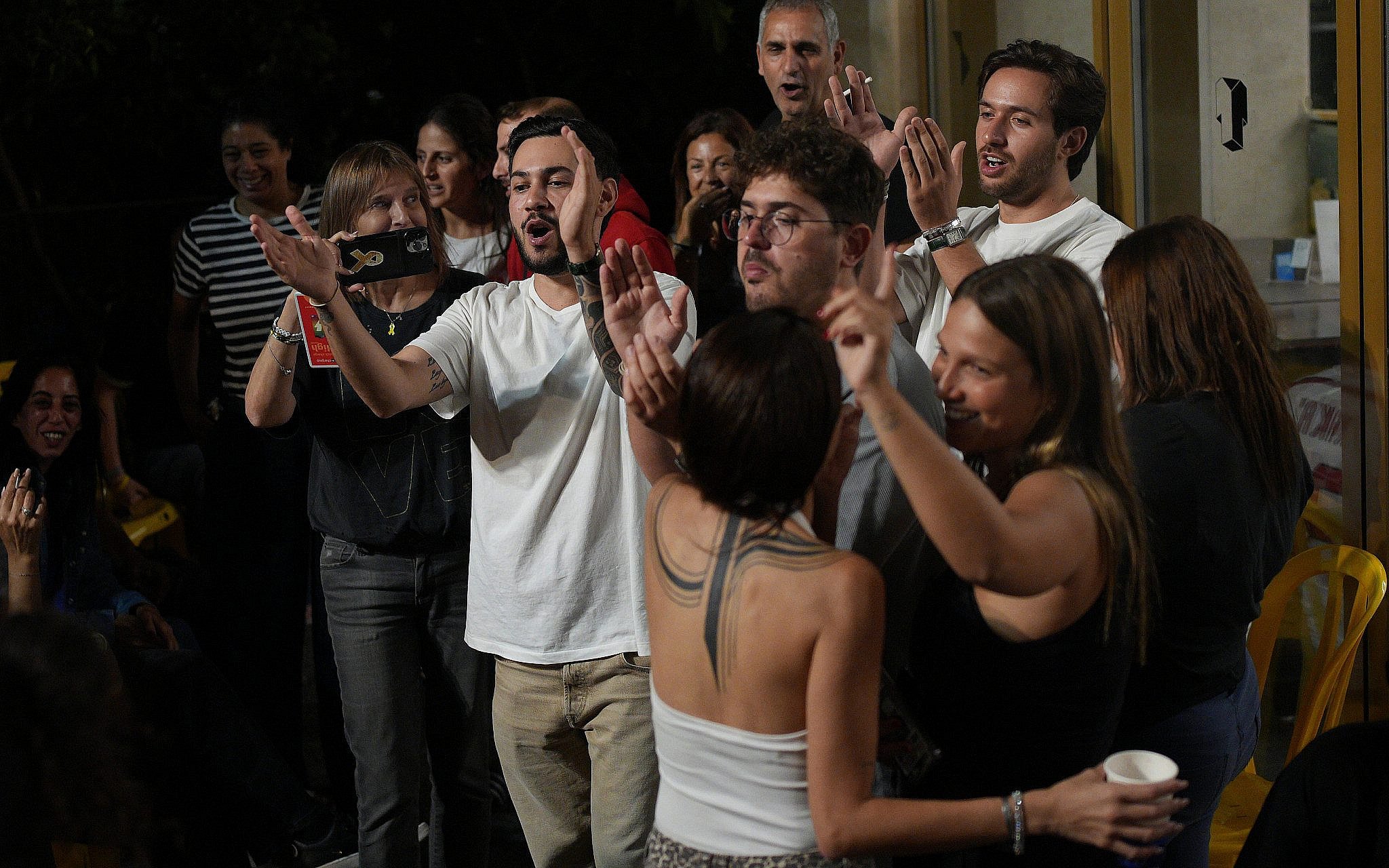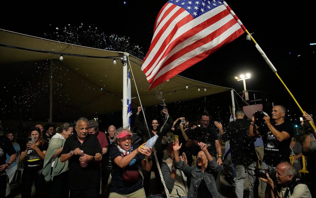Freed captives, relatives of hostages and their supporters celebrate after the announcement that Israel and Hamas have agreed to the first phase of Gaza ceasefire plan, as they gather at Hostages Square in Tel Aviv, October 9, 2025. (AP Photo/Ohad Zwigenberg)
