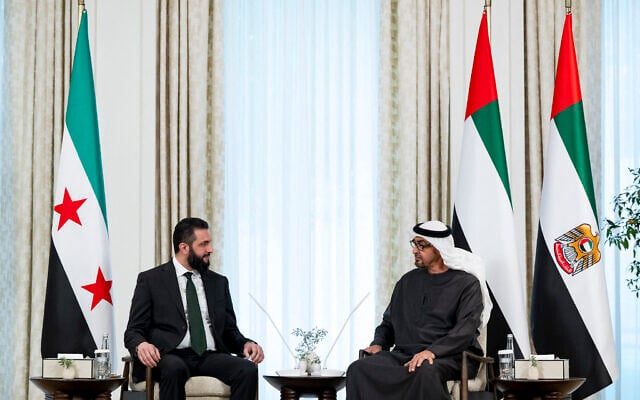 This handout picture provided by the UAE Presidential Court shows Emirati President Sheikh Mohamed bin Zayed al-Nahyan (R) meeting with Syria’s interim President Ahmed al-Sharaa at Al-Shati palace on April 13, 2025. (Abdulla AL-BEDWAWI / UAE PRESIDENTIAL COURT / AFP)