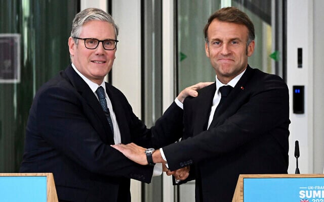 British Prime Minister Keir Starmer, left, and French President Emmanuel Macron hold a joint press conference in London, July 10, 2025. (Leon Neal/Pool Photo via AP)