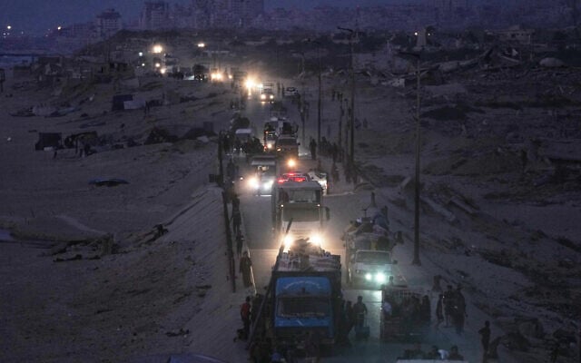 Displaced Palestinians flee northern Gaza, by vehicle and on foot, carrying their belongings along the coastal road near Wadi Gaza, September 26, 2025. (AP Photo/Abdel Kareem Hana)