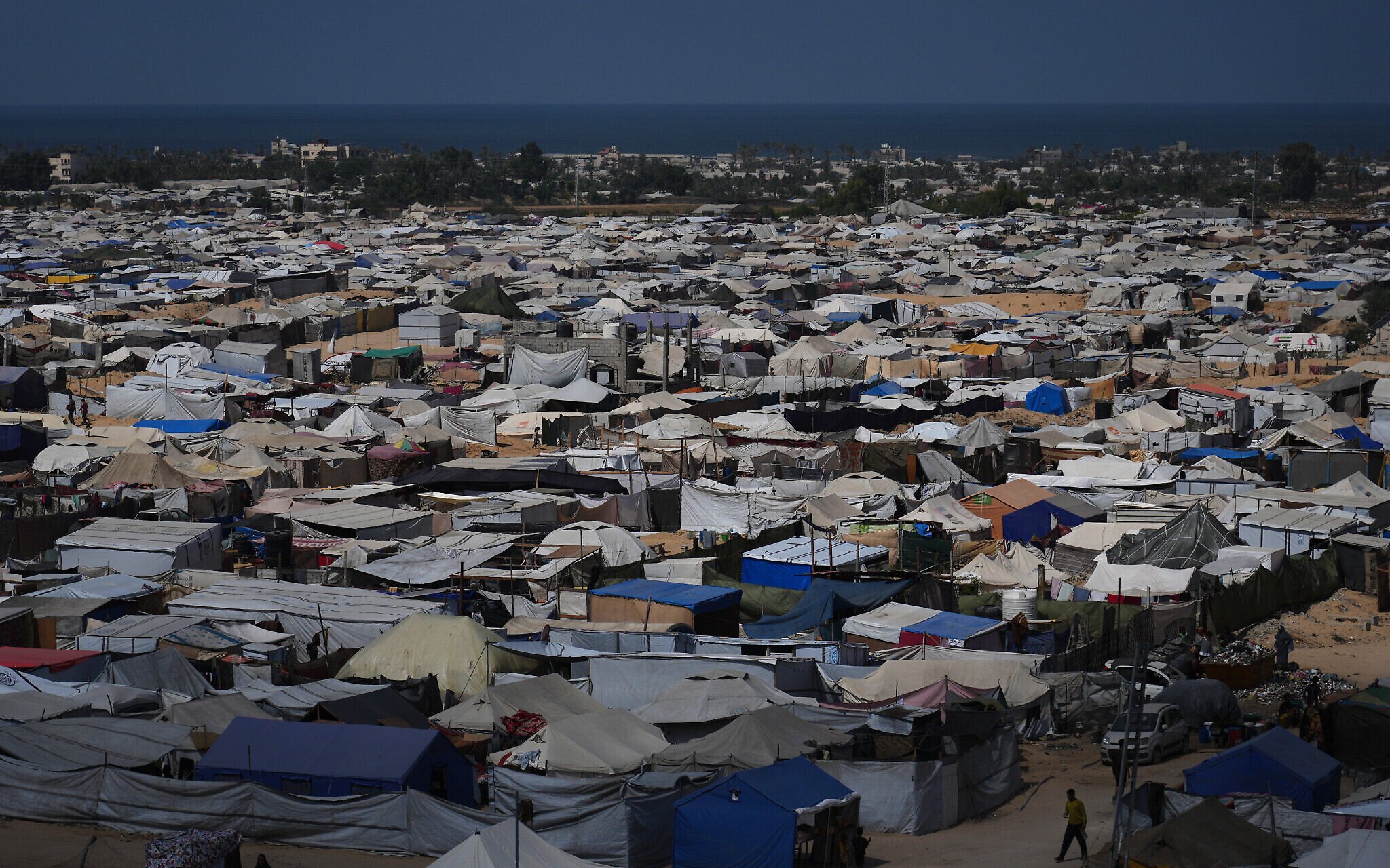 Displaced Palestinians walk through a tent camp in al-Muwasi, an area that Israel has designated as a safe zone, in Khan Younis southern Gaza Strip, September 29, 2025. (AP Photo/Jehad Alshrafi)