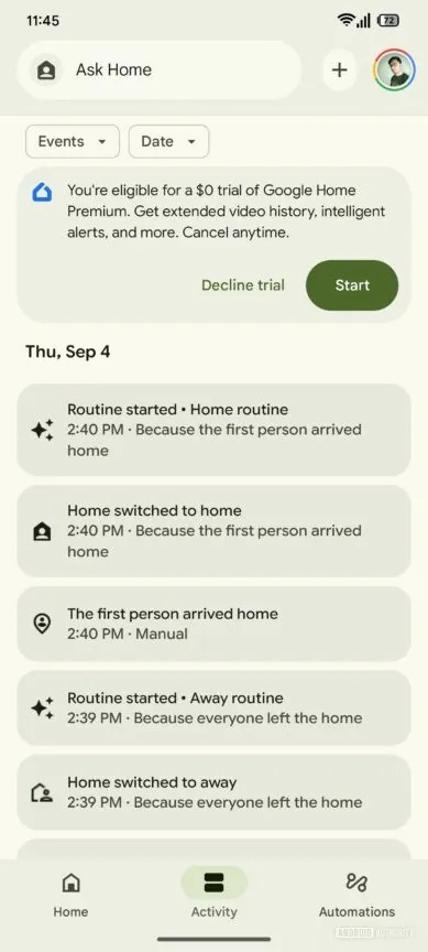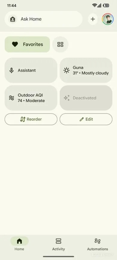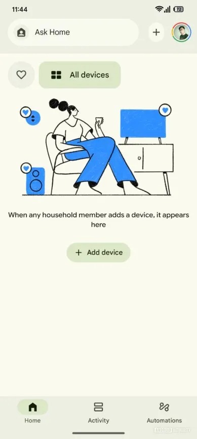 The new app drops down to just three tabs along the bottom – Home, Activity, and Automations. An “Ask Home” search bar shows up at the top, and the main Home page then shows your favorite devices as well as a new button to show the rest of the list of devices. The Settings, Inbox, and other displaced features are then offloaded to the profile overflow menu.