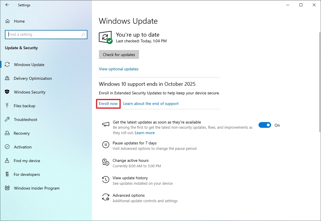 - Check for the “Your PC is enrolled to get Extended Security Updates” message in the Windows Update settings to confirm the enrollment.