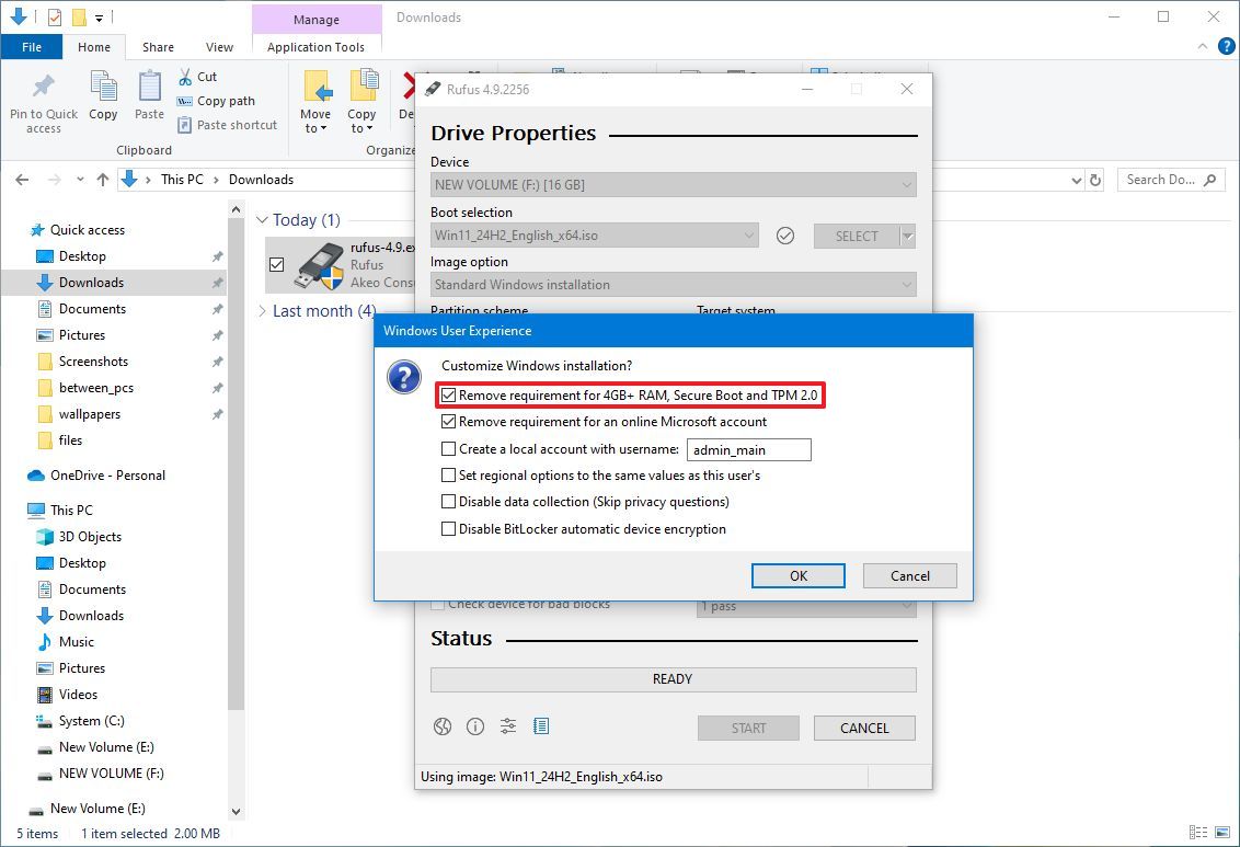 - Check the “Remove requirement for 4GB+RAM, Secure Boot and TPM 2.0” option to create a USB flash drive for unsupported devices.