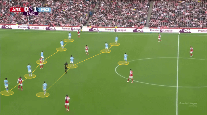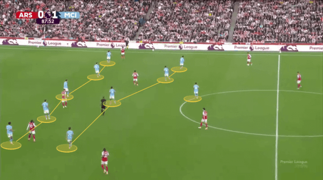 Eventually, Guardiola realised that since Foden was spending so much time dropping back into defence, he might as well bring on an actual fifth defender, so he sacrificed his most creative player — on paper — for a centre-back, Nathan Ake. Later, he went further and withdrew Haaland in favour of Nico Gonzalez. He was basically fielding a back five, four central midfielders, and Jeremy Doku in an unfamiliar centre-forward role.