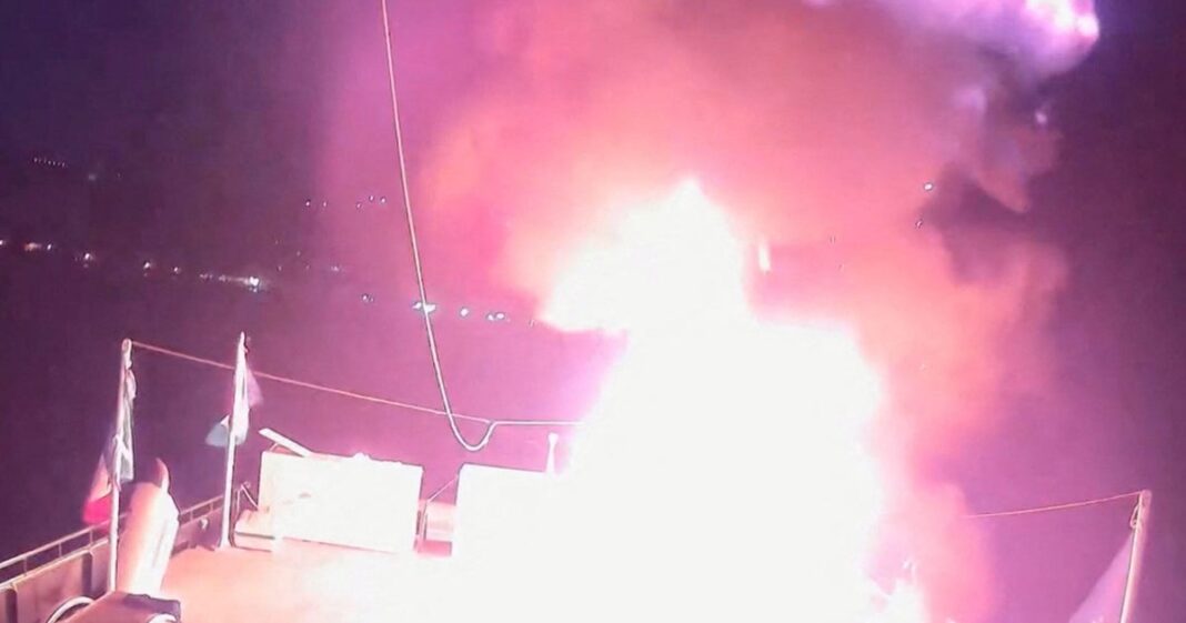 Footage released by the Global Sumud Flotilla and obtained by CBS News appears to show a ball of flames falling onto the boat, sparking the fire on board, instead of the fire originating from inside the vessel. The stationary cameras affixed to the vessels do not capture where the flames originated from prior to landing on the boat nor do they depict a flare gun being fired.