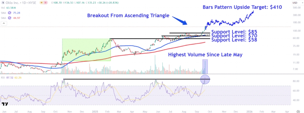 After breaking out from a textbook ascending triangle early last week, Oklo shares shot higher, signaling a continuation of the stock’s long-term uptrend.