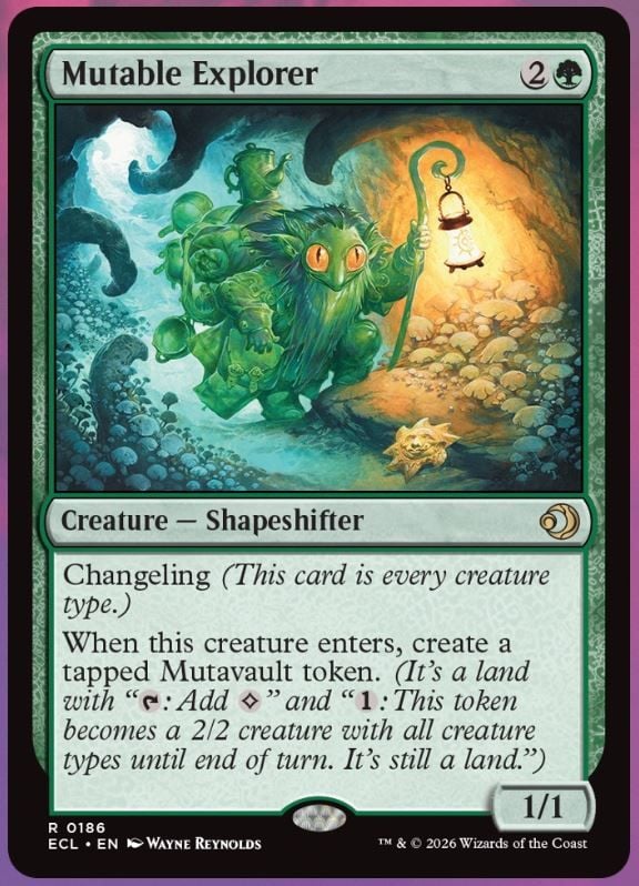 If you’re curious about Booster Fun treatments, there’s a new “Fable Frame” that looks similar to the Wilds of Eldraine Enchanting Tales bonus sheet treatment. It looks fun and whimsical, and we’ve got a taste of what that’ll look like. The Headliner and fuzzy little Mutable Explorer will get these treatment, among other cards.