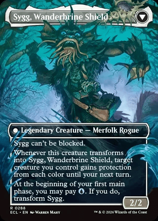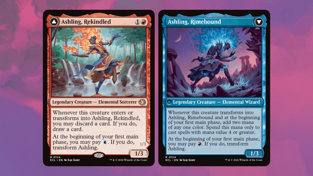 Ashling’s back too, as a transforming red/blue elemental. Notice that sorcerer creature type on the front! Mark Rosewater confirmed double-faced cards wouldn’t be a huge part of the set, but they are used on quite a few of the legends of the set.