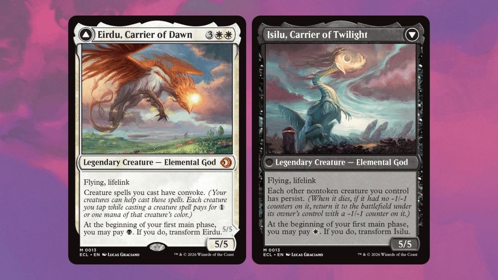 There’s plenty of talk about the night and day aspect of the plane, but don’t worry, daybound/nightbound isn’t returning! Instead, they’re representing day/night using transforming double-faced cards. Eirdu, Carrier of the Dawn represents this mechanic perfectly, swapping between a convoke enabler and a persist enabler.