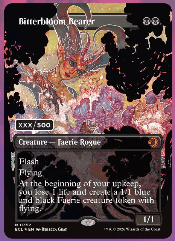 We also got a look at ECL’s Headliner card! We saw Bitterbloom Bearer in the leaks earlier, but this is a serialized version of the Bitterblossom callback!