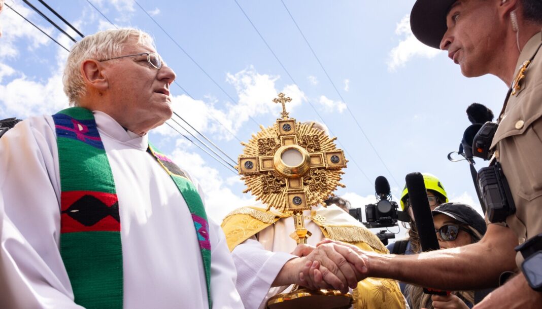 The Rev. Larry Dowling, one of the priests holding the communion elements, said, “We’re just very disappointed because we simply wanted to bring the love of God and the presence of the Eucharist to these prisoners, which we had been allowed to do before all this stuff happened. So they’re basically rejecting us bringing the presence of Christ and the love of God.”