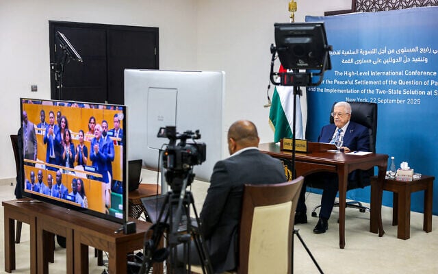 This handout picture provided by the Palestinian Authority’s press office shows Palestinian Authority President Mahmoud Abbas applauding as he gives a video address to a UN summit on a two-state solution in New York City, from his headquarters in Ramallah on September 22, 2025. (Thaer GHANAIM / PPO / AFP)