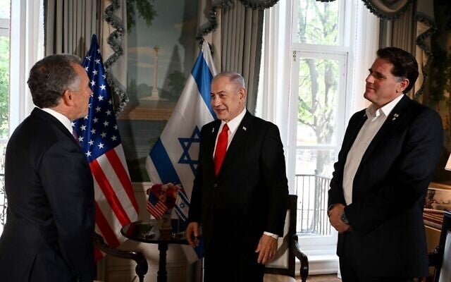 Prime Minister Benjamin Netanyahu (C) and Strategic Affairs Minister Ron Dermer (R) speak with US envoy to the Mideast Steve Witkoff (L), during the premier’s visit to Washington, DC on July 7, 2025. (Avi Ohayon/GPO)