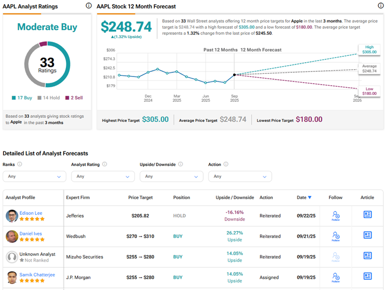 Top Wedbush analyst Daniel Ives boosted his price target for Apple (AAPL) stock to $310 from $270 and reiterated a Buy rating. The 5-star analyst raised his price target based on solid early demand signs for the iPhone 17 cycle. Ives stated he was “positively surprised” by the iPhone 17’s demand trajectory, with units that now seem to be tracking 10% to 15% ahead of iPhone 16 so far.