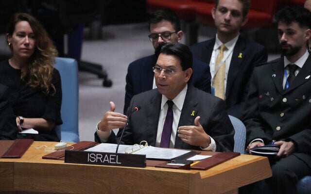 Israeli Ambassador to the UN Danny Danon speaks during a United Nations Security Council emergency meeting in New York on June 22, 2025. (Bryan R. Smith / AFP)